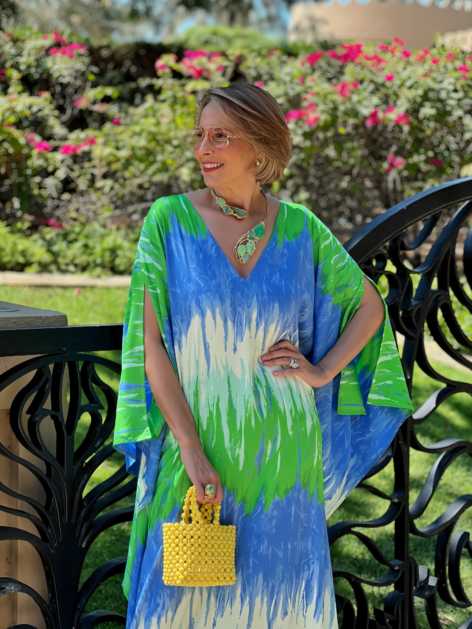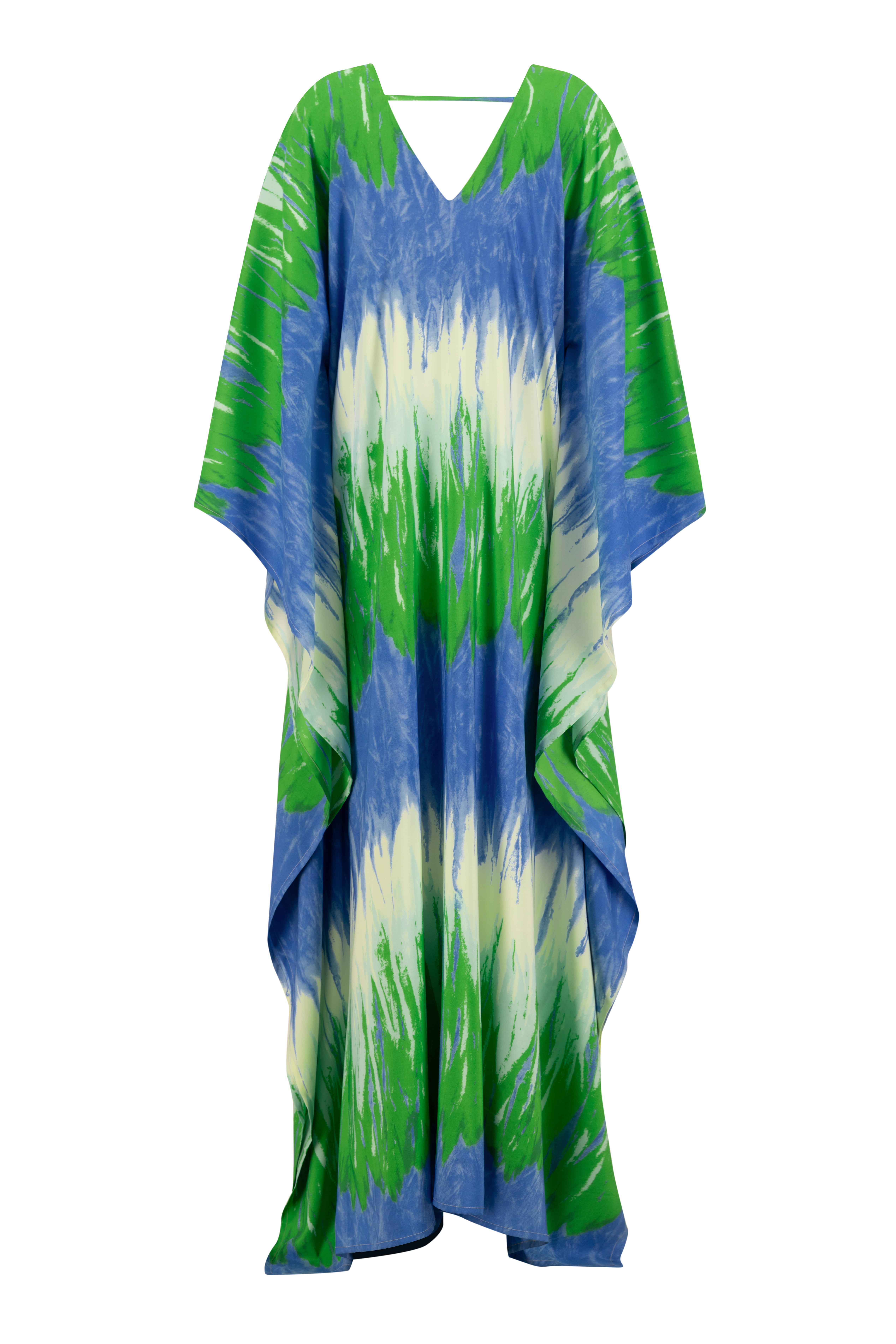 Effortlessly elegant and versatile, this crepe silk kaftan features a striking tie-dye design in vibrant hues of green, blue and white. The flowing silhouette is complemented by a double V-neckline at the front and back, and open sleeves that offer graceful movement and an airy feel. fully lined for comfort, this free-size kaftan transitions seamlessly from a chic beach coverup to a sophisticated evening ensemble. Just accessorize to match the occasion.