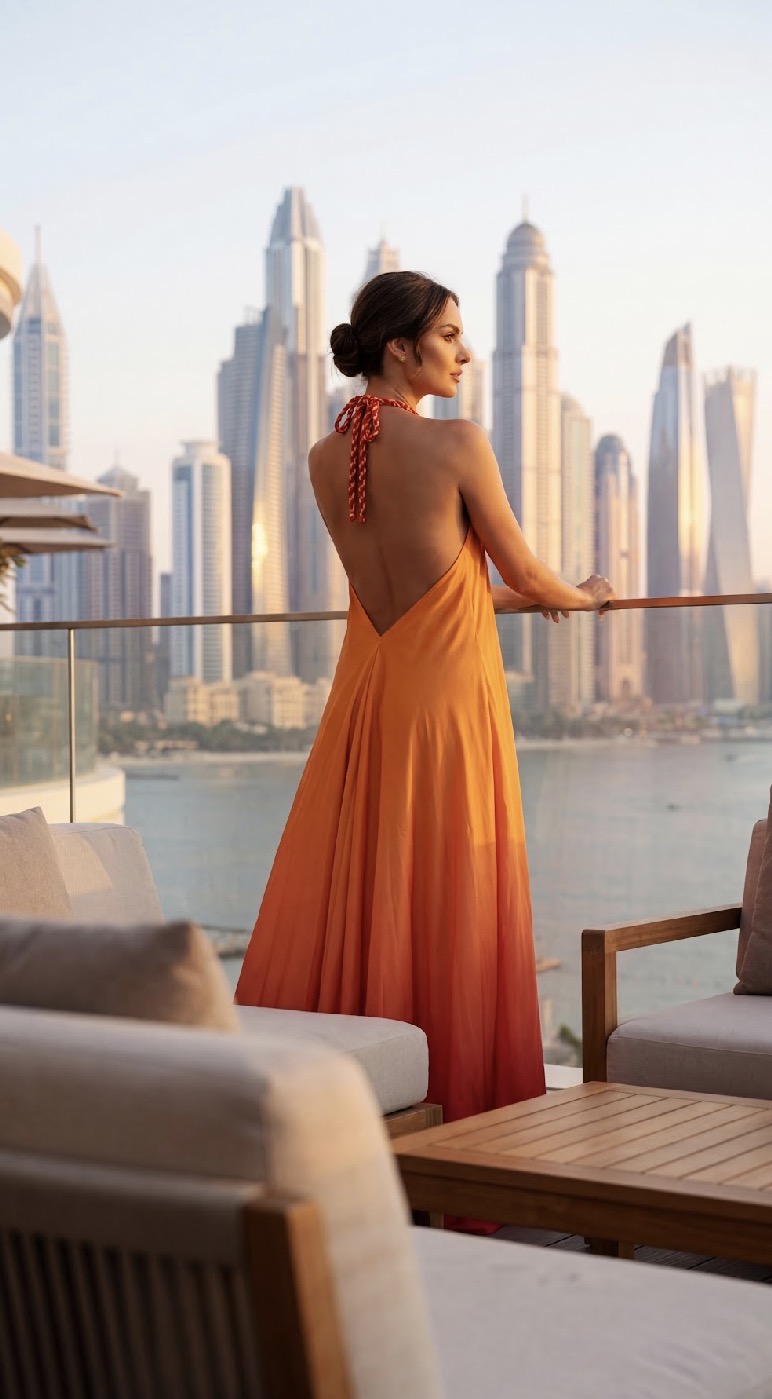 An expression of effortless luxury, this silk crepe maxi dress is designed to move with fluid grace. The lightweight fabric drapes beautifully while a softly plunging neckline is framed by delicate braided detailing for a refined finish. The halter silhouette reveals an elegant open back with adjustable ties, adding a subtle allure. Falling into a sweeping, full-length skirt, the design is elevated by a warm ombre gradient that transitions from radiant orange to deep coral – capturing the glow of golden hour. A timeless statement for elevated summer and resort dressing.