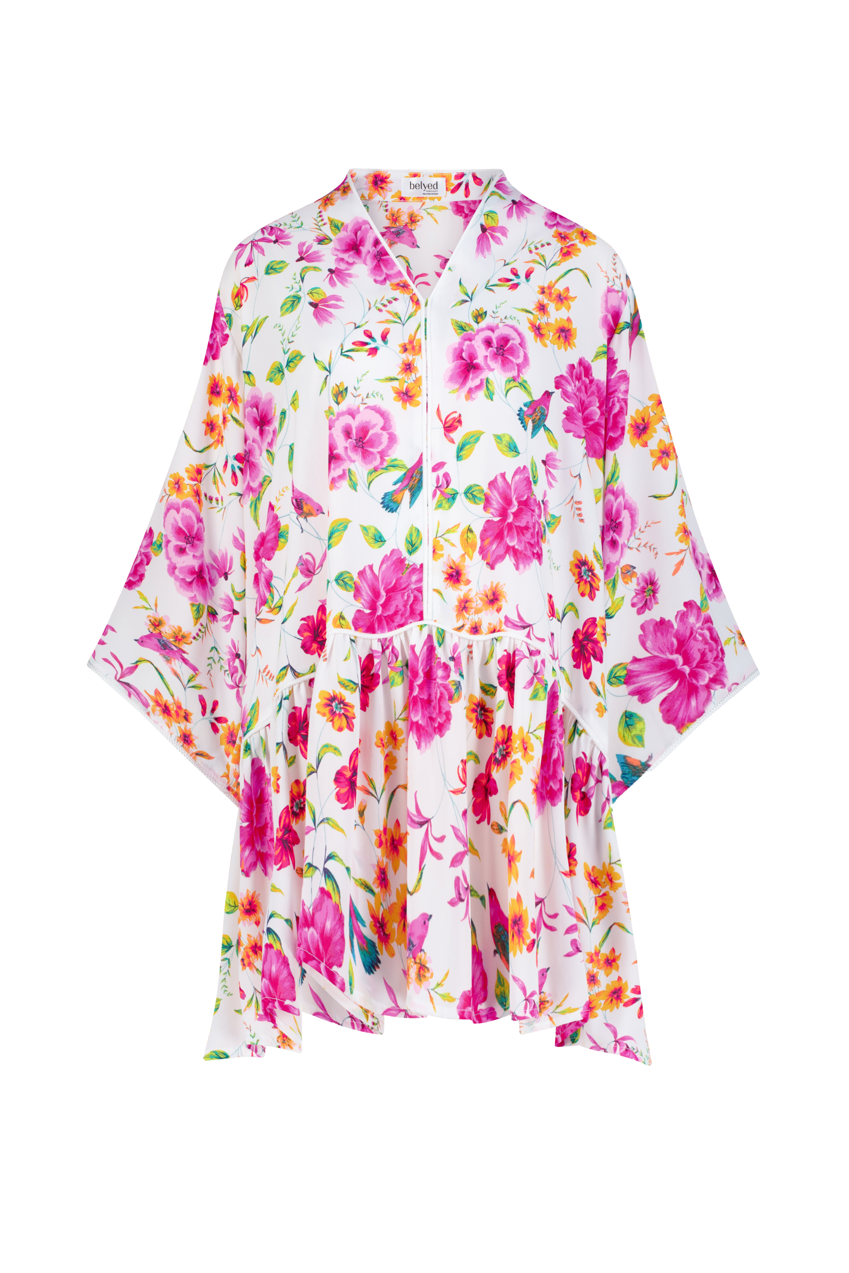 Our Nelly floral dress characterized by a loose and flowy design. A white base with an all over floral pattern that inspire spring and summer. The dress has wide, three quarter length sleeves and a V-neckline with a subtle collar. the lower waist line is slightly gathered, which adds some volume and structure to the overall comfortable fit. The vibrant floral print contribute to a fresh summery appearance making it suitable for warm weather occasions.