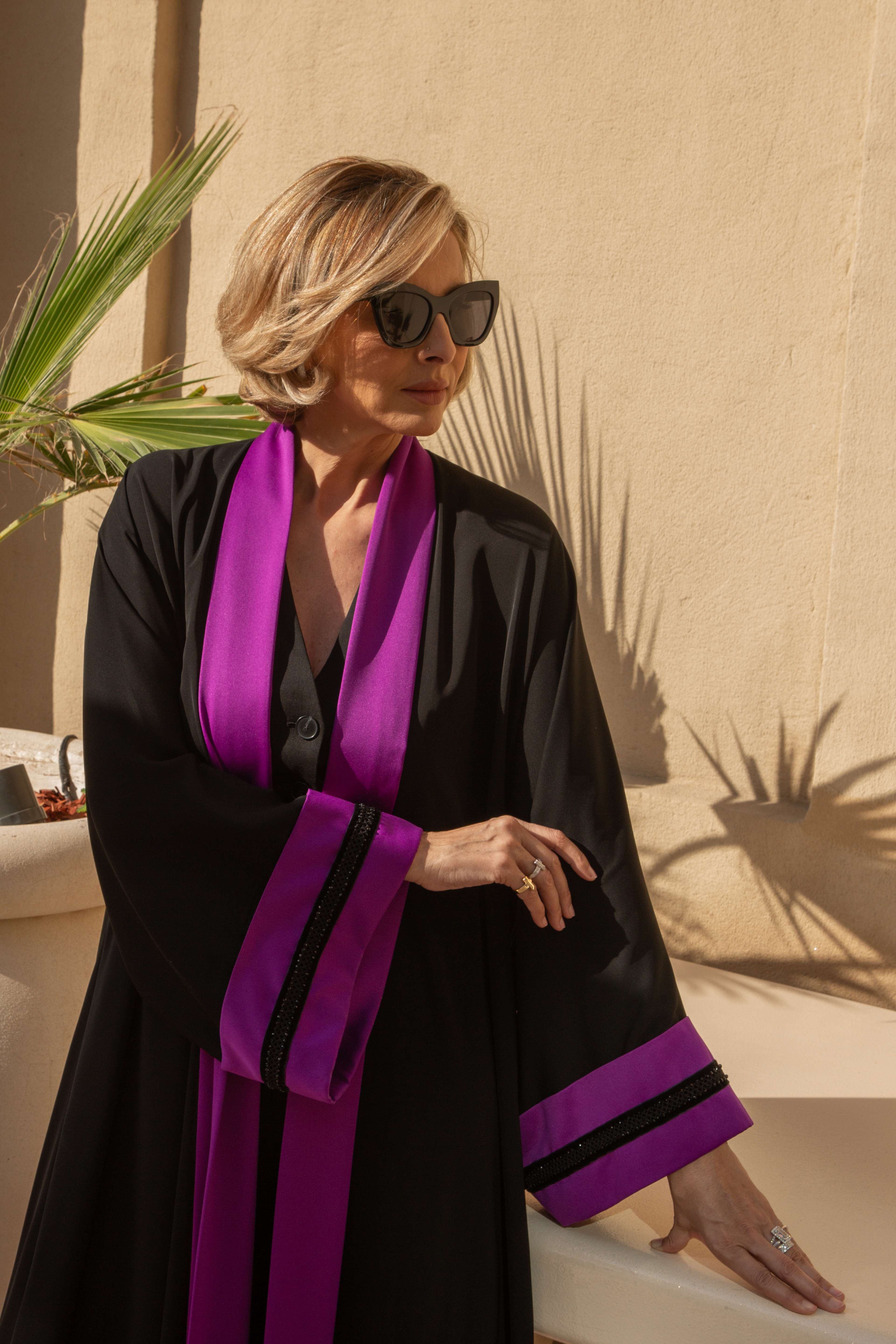 Crafted from sumptuous purple crepe silk, the Tafrit kaftan flows fluidly over the body, creating a silhouette that is both powerful and feminine. Refined grey ornamental detailing adorns the front, adding a subtle contrast and artisanal character that elevates the design.